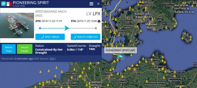 По данным навигационного портала, крупнейший трубоукладчик в мире Pioneering Spirit вошел в Балтийское море. Судно движется на скорости 10 узлов в час (чуть меньше 20 километров в час) и утром прошло пролив Фемарн-Бельт между Германией и Данией. По переданным по АИС данным, сегодня, 25 ноября, у Pioneering Spirit запланирован приход в латвийский порт Лиепая. До него, правда, судну необходимо преодолеть более 600 километров, и, очевидно, оно прибудет с задержкой. Pioneering Spirit известен тем, что укладывал «Турецкий поток» в Черном море и уже участвовал в строительстве «Северного потока-2».