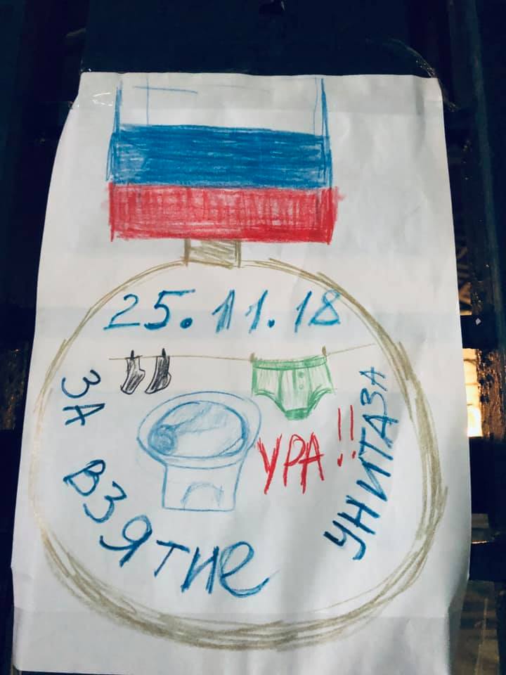 Пикетчики поддержали командование ВМСУ и вернувшихся по обмену из РФ моряков, утверждающих, будто на возвращенных из Крыма катерах пропали унитазы, туалетная бумага и нижнее бельё членов экипажей.