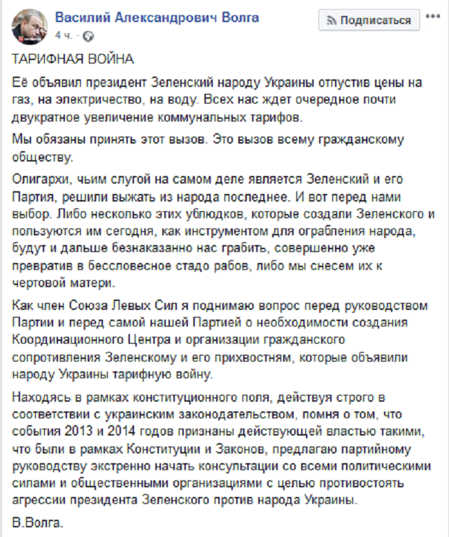«"Зеленые слуги" полностью отпустили в "свободное плавание" тарифы на отопление и воду, с нового года это же произойдет с ценой на газ, а затем — и на электрическую энергию. Монополисты получили от них полную свободу варварского ценообразования и 100% зеленый свет в грабеже людей, а большинство людей окончательно превратятся в рабов "коммунальной мафии"».