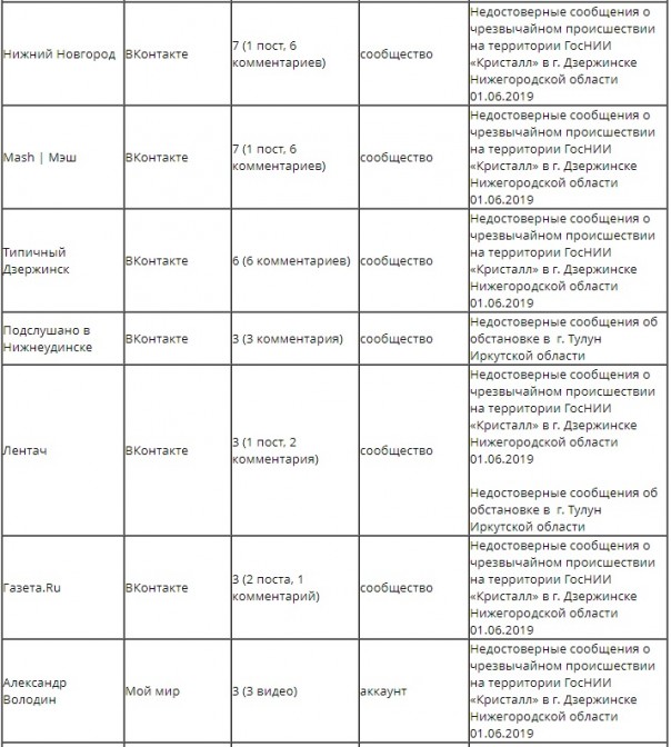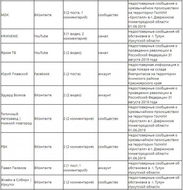 Судя по списку, указанные источники — а их всего около 30 — уличили в искажении информации о паводке в Тулуне, о взрывах на заводе в Дзержинске, пожаре на складе боеприпасов в Ачинске, массовых беспорядках в селе Чемодановка, а также других событиях.