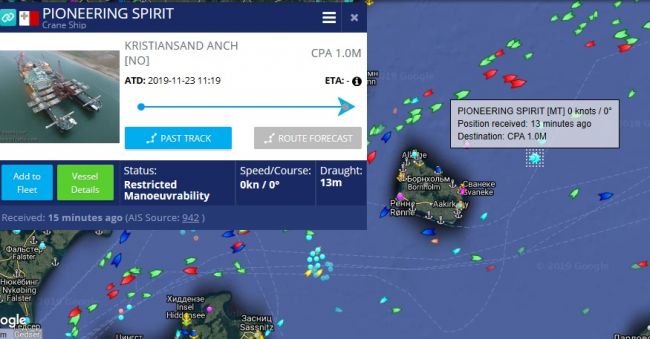 Сегодня утром трубоукладчики остановили движение, чтобы, очевидно, принять на борт очередной груз труб. Так, из немецкого Мукрана на крупнейший в мире трубоукладчик Pioneering Spirit доставило груз судно снабжения Bourbon Topaz, а на Solitaire — Algeria. Также, очевидно, с трубами у второго трубоукладчика находятся суда снабжения Fortress и Standard Princess. Solitaire меньше, чем Pioneering Spirit, и может взять на борт на 5 тыс. тонн труб меньше — 22 тыс. тонн.