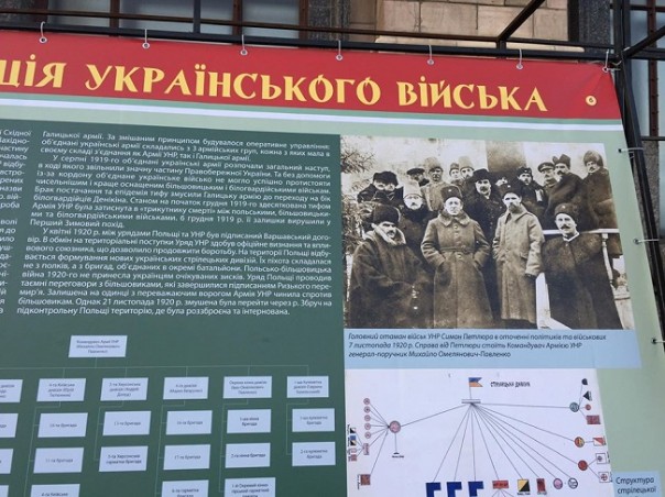 В Киеве на Крещатике возле Главпочтамта Институт национальной памяти проводит выставку, посвященную вооруженным формациям эпохи Украинской революции «Украинская армия: 1917-1921», которая в большинстве своём прославляет нацистских коллаборантов.