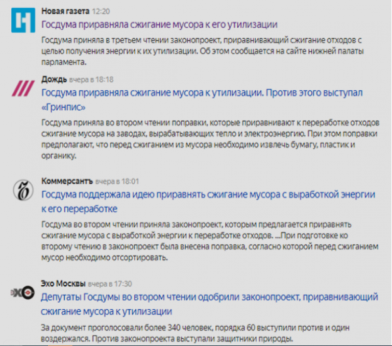 Некоторые либеральные СМИ попытались ввести в заблуждение читателей по поводу нового закона об «утилизации отходов». В своих публикациях они акцентировали внимание на том, что сжигание мусора приравнивается к «утилизации». В своих материалах они приводят мнение эксперта из «Гринписа», который обеспокоен тем, что новый закон значительно затормозит развитие мусороперерабатывающих заводов, так как основные средства будут потрачены на строительство предприятий по сжиганию отходов.