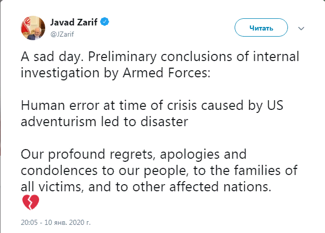 Глава МИД Джавад Зариф, в свою очередь, написал в Twitter, что к авиакатастрофе привела "человеческая ошибка в период кризиса, спровоцированного авантюризмом США". Он также принес соболезнования и извинения семьям погибших в авиакатастрофе.