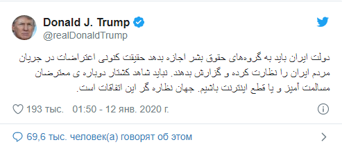 В Twitter американский лидер обратился к протестующим на персидском языке (фарси), опубликовав английский перевод обращений.