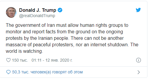 Затем Трамп обратился к властям Ирана с призывом допустить правозащитников отслеживать ситуацию с правами протестующих. По его словам, Тегеран не должен устраивать «расправы над мирными протестующими» или отключать интернет.