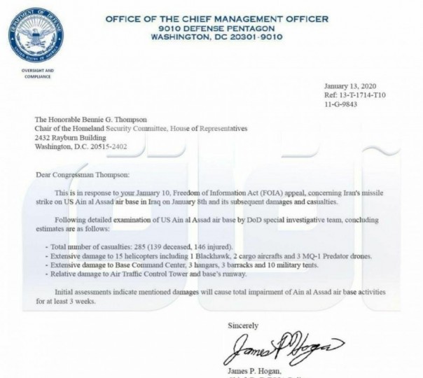Сайт иракского спутникового телевидения "Afaqi" опубликовал документ о масштабах потерь США из-за ракетных атак Ирана на базу Аль-Асад, утверждая, что документ был составлен после проверки специальной следственной группой Министерства обороны США.