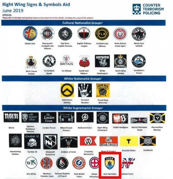 Пособие, подготовленное антитеррористическим отделом британской полиции, распространяется по всей стране в рамках подготовки к программе по борьбе с радикализацией. Она предназначена для выявления лиц, которые могут угрожать совершением насилия. В нем помимо свастики и трезубца встречаются символы противников ГМО-продукции и движения "Гринпис".