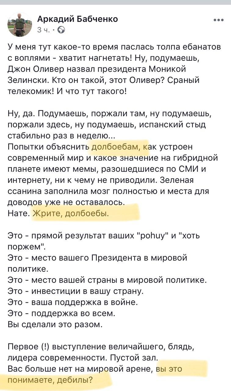 «Вас больше нет на мировой арене, вы это понимаете, дебилы? Страна, само существование которой решается в данный момент, которая всего год назад была гвоздем Европы, её главной темой, потому что все понимали, что самая главная точка напряжения и бифуркации сейчас здесь, и от того, как все разрешится, будет зависеть будущая конфигурация мира, сегодня оказалась н***й никому не нужна на главном экономическом форуме. Мои поздравления. Вы помните, дебилы, что вас именно об этом и предупреждали? Вы помните, что я на коленях ползал, в уши орал – очнитесь, что вы делаете?» – разразился проклятиями Бабченко в своем блоге.