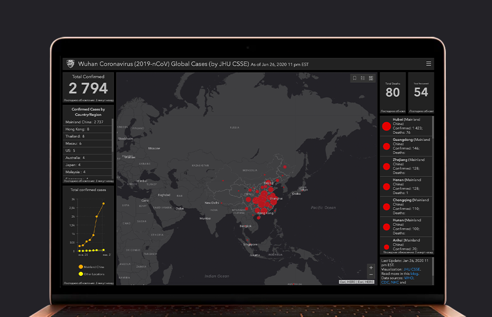 Центр системных исследований и инжиниринга при Университете Джона Хопкинса в Балтиморе разработал сервис с постоянно обновляющейся статистикой распространения коронавируса.