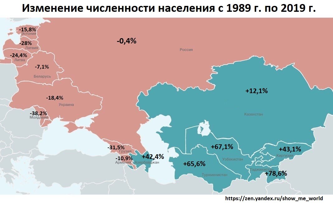 А вот на серьезные цифры увеличилось население в Таджикистане (+78,6%), Узбекистане (+67,1%), Туркменистане (+65,6%). На постсоветском пространстве сейчас проживает 296 миллионов человек (на 10 млн больше, чем в 1989 году). Источник