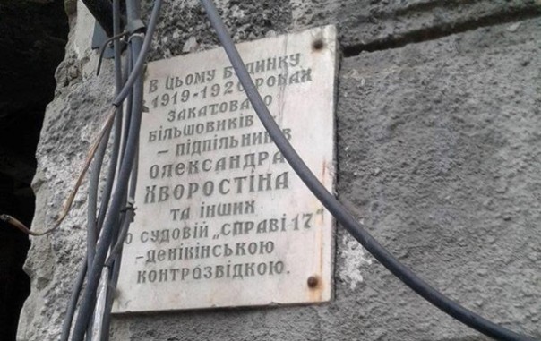 "Осуществлен демонтаж доски, где указано, что в 1919-1920 годах в этом же доме "была замучена" группа партизан-большевиков по "делу 17" во главе с Александром Хворостиным", - радостно сообщает Южное отделение украинского института национальной беспамятства имени Альцгеймера в мордокниге.