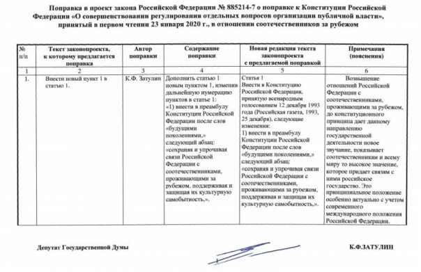 «Вношу предложение внести в преамбулу Конституции Российской Федерации поправку (дополнение): после слов «будущими поколениями» добавить абзац «сохраняя и упрочивая связи Российской Федерации с соотечественниками, проживающими за рубежом, поддерживая и защищая их культурную самобытность», - в частности, сказано в его письме сопредседателю Рабочей группы, председателю Комитета Госдумы РФ по государственному строительству и законодательству Павлу Крашенинникову.