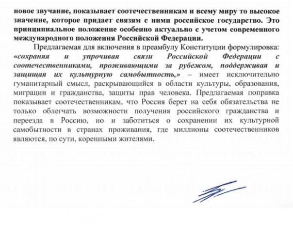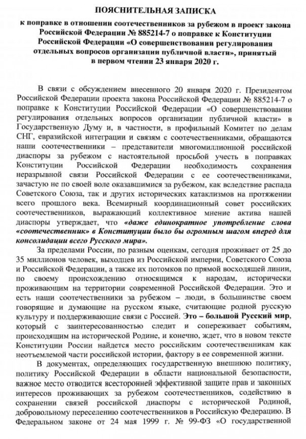 В пояснительной записке отмечается, что, по разным оценкам, за пределами РФ проживает 25-35 миллионов выходцев из Российской империи, СССР и Российской Федерации, а также их потомков по прямой восходящей линии, по своему происхождению относящимся к народам, исторически проживающим на территории современной России. Поэтому важно, чтобы для российских соотечественников нашлось место в новом тексте Конституции РФ.