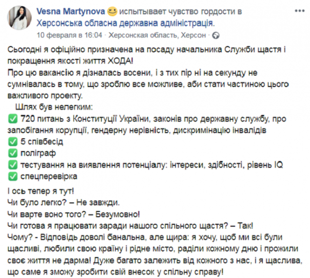 Новосозданную Службу счастья и улучшения качества жизни в Херсонской областной госадминистрации возглавила 32-летняя директор магазина одежды «Pull and Bear Украина» Весна Карпук.