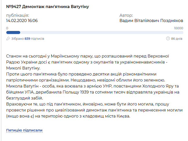 «По состоянию на сегодня в Мариинском парке, что расположен перед Верховной Радой Украины, до сих пор есть памятник одному из оккупантов и украиноненавистников — Николаю Ватутину. Против этого памятника были проведены десятки акций различными патриотическими организациями. Недавно неизвестные облили его зеленкой», — говорится в петиции на сайте Киевского городского совета.