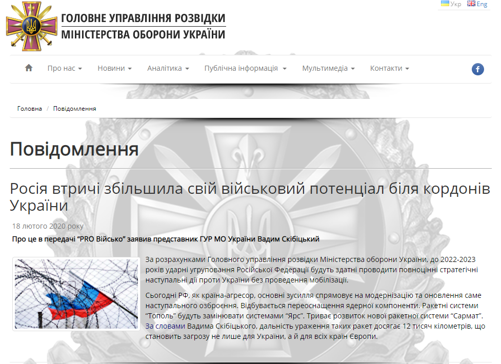 "К 2022-2023 годам (российские. — Прим. ред.) ударные группировки будут способны проводить полноценные стратегические наступательные действия против Украины без мобилизации", — приводятся его слова на сайте ведомства.