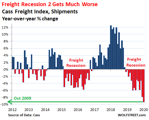 Отчет Cass Freight Index который отслеживает грузы в США всеми видами транспорта (и автоперевозки, и железные дороги, и речные, и авиа) сообщает, что объемы перевозок снижаются 14 месяцев подряд (то есть падение идет уже второй год подряд и теперь происходит относительно месяцев, кв которых уже было падение), причем скорость падения нарастает - в декабре падение составило 7.4% относительно декабря 2018, а в январе оно составило 9.4%, и то, хуже этого было лишь в период краха 2009 года.