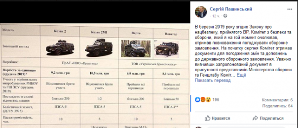 «В начале августа Комитет получил документы для согласования изменений и дополнений в государственный оборонного заказа. Внимательно изучив предложенный документ в присутствии представителей Министерства обороны и Генштаба Комитет единогласно проголосовал за документ с замечаниями. Этим решением фактически блокировалась закупка 40 автомобилей "Казак" по цене 8 млн. 400 тыс. грн., Поскольку были сомнения в объективности их цены. Да и не считали, что на тот момент закупка этих машин была актуальной для поднятия обороноспособности нашего государства», — пояснил экс-нардеп.