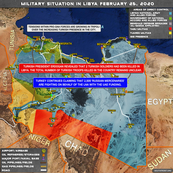 В настоящее время ПНС, признанное ООН, контролирует только столицу Триполи и некоторые прибрежные районы - на карте, актуальной на 25 февраля, территория обозначена зеленым. Фельдмаршал Халифа Хафтар со своей Ливийской национальной армией, за которую должны болеть мы, в последние недели серьезно продвинулся к столице и контролирует большую часть страны. На карте отмечены также территории, подконтрольные запрещенной в России группировке ИГИЛ (в черную полоску), исламистским «Бригадам обороны Бенгази» (территория, похожая на черную плесень), желтым и красным выделены земли, удерживаемые мятежными племенам туарегов и табу.