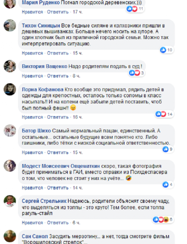 «Кто вообще это придумал, рядить детей в одежды для крепостных, осталось только соломы в класс насыпать!! И на колени ещё забыли детей поставить, чтоб был полный фешн!!» — поддерживают маму с мальчиком пользователи соцсети.