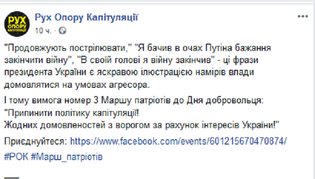 «Рух сопротивления капитуляции», ранее проводивший митинги под окнами Зеленского, также не прекращает агитационную работу, призывая «патриотов» принять участие в марше.