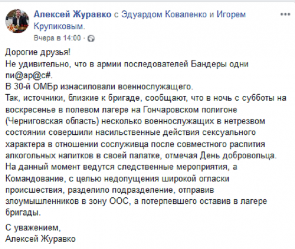 В ночь с субботы на воскресенье в полевом лагере на Гончаровском полигоне (Черниговская область) несколько военнослужащих 30-й ОМБр в нетрезвом состоянии совершили насильственные действия сексуального характера в отношении сослуживца после совместного распития алкогольных напитков в своей палатке, отмечая День добровольца.