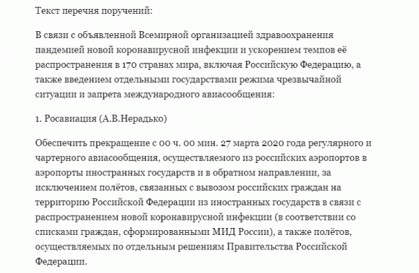Правительство поручило прекратить регулярное и чартерное авиасообщение