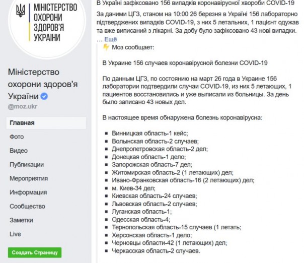 По данным МОЗ, на утро 26 марта коронавирус на Украине зафиксирован уже в 15 областях и Киеве, зафиксировано 156 заражений и исследуются 37 подозрений: в Луганской, Херсонской, Донецкой и Винницкой областях по 1-му случаю Covid-19, во Львовской, Днепропетровской, Житомирской, Черкасской и Волынской областях по 2 случая заражения, в Одесской области - 4 случая, в Запорожской области - 7 случаев, в Тернопольские - 15, в Ивано-Франковской - 16, в Киевской - 24, в Черновицкой - 42 случая заражения и Киеве - 34 случаев.