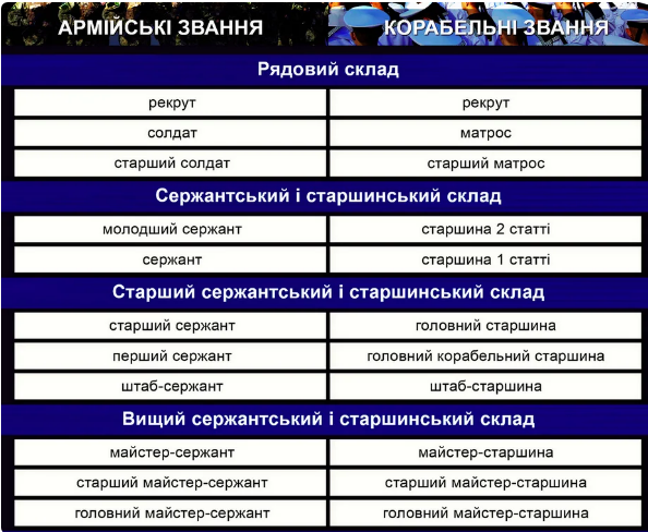 Ребята, но это кабздец полный! Надо полагать, что штаб-старшина (исходя из названия звания) этот тот чувак, который сидит в штабе. А мастер-старшина, это тот человек который мастер на все руки и занимается ремонтом за всех? Выходит так. А старший мастер-старшина вообще младший помощник старшего дворника. Понятно, что это авторская ирония, но накрутили чересчур. Дело в том что новая система воинских званий рядового, сержантского и старшинского состава в/на Украине выглядит таким образом: