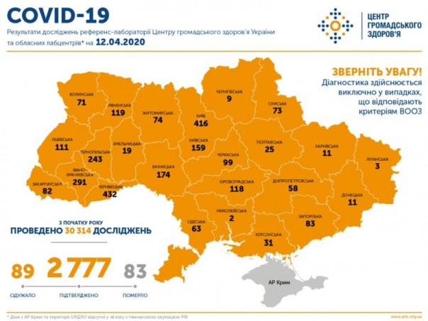 Добавим, по состоянию на 09:00 12 апреля на Украине зафиксировано 2777 случаев коронавирусной болезни COVID-19. Из них 83 летальные, 89 пациентов выздоровели. За сутки зафиксировано 266 новых случаев, среди них двое заболевших в Николаевской области, которая ранее считалась свободной от заболевания, пенсионерки из одного села и сейчас они находятся в реанимации.