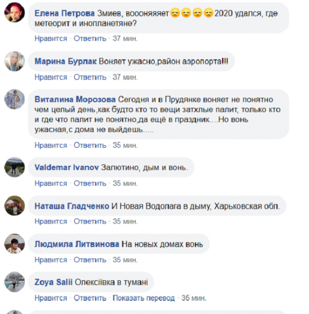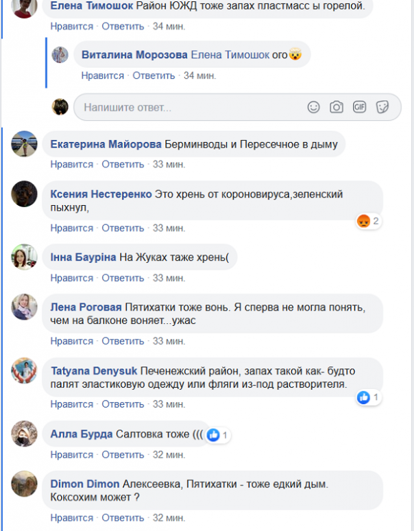 Отметим, если салтовчане сообщают о загоревшейся мусорной свалке: «В Харькове горит мусор, ВОНЬ ПЛАСТИКА СТОИТ НЕИМОВЕРНАЯ!», то вонь и гарь в центре, на Павловом поле и Холодной горе идёт с киевского направления, так как о невыносимом запахе и смоге сообщают в соцсети жители Полтавы, Огульцов, Мерчика, Валок, Люботина (эти населённые пункты расположены вдоль трассы Киев—Харьков — ред.).