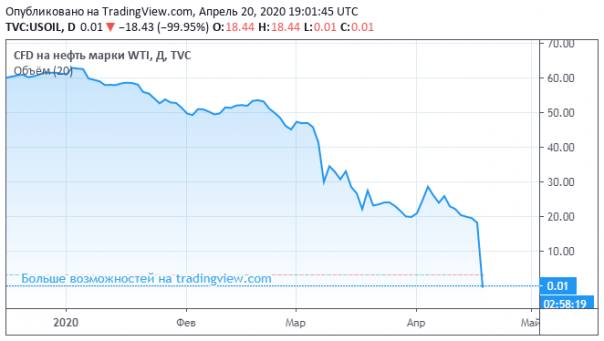 По данным на 20:56 (мск), стоимость майских фьючерсов WTI рухнула до $0,01 за баррель.