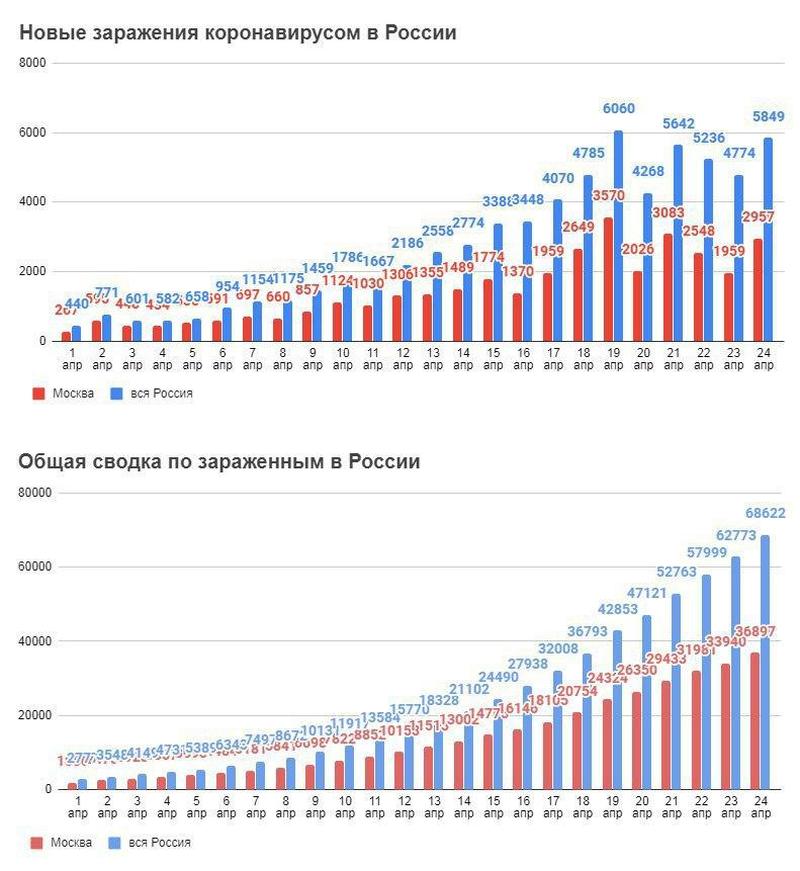 Всего по состоянию на утро 24 апреля в России зарегистрировано 68 622 случая коронавируса в 85 регионах.