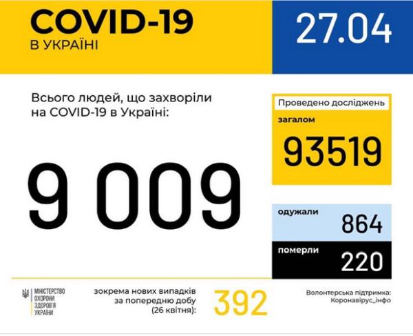 На сегодняшний день на Украине число инфицированных COVID-19 выросло до 9009 (+392 за сутки) из них 220 летальных, исцелены 864 пациентов.