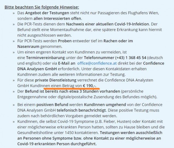 «Отмечается, что пассажиры смогут пройти ПЦР-тест на коронавирус сразу в аэропорту и получить результаты уже через два-три часа. «Воздушные путешествия, например деловые или неотложные поездки станут более безопасными или легче», - подчеркнули представители аэропорта. Тест, который скромно называют «частной услугой» будет стоить 190 евро. Отрицательный результат позволяет избежать обязательного для прибывших в страну из-за границы двухнедельного карантина. Материал для исследования будут брать из глотки или носа, к тестированию будут допускаться исключительно лица без симптомов заболевания», - информирует сайт венского аэропорта.