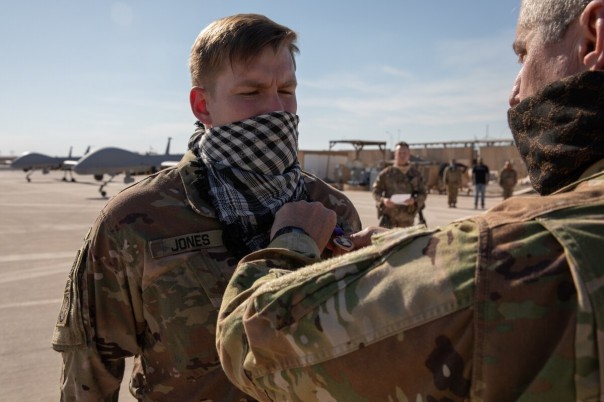 3 мая 2020 года. Командир 34-й экспедиционной боевой авиационной бригады полковник Грег Фикс вручает специалисту Роберту Джонсу медаль "Пурпурное сердце" за сотрясение мозга, полученное во время иранской атаки