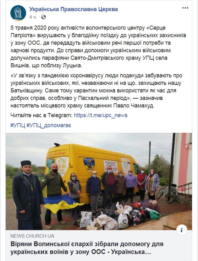 Украинская православная церковь (МП) присоединалась к акции волонтеров по помощи украинским военным в зоне ООС (бывшая АТО) на Донбассе.