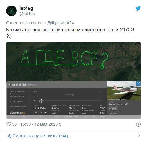 В середине мая авиационный портал Flightradar зафиксировал в небе над Колыванским районом на северо-востоке Новосибирской области надпись «А где все?».