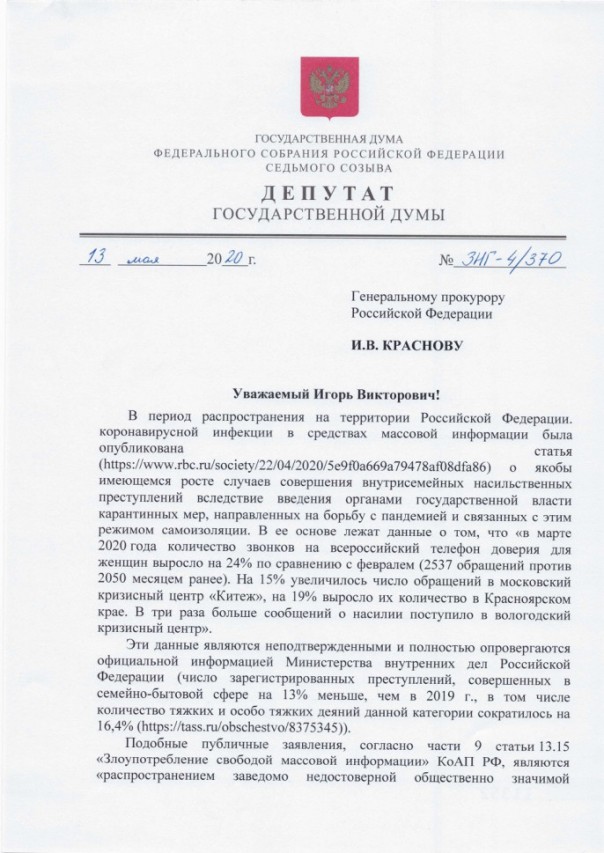 13 мая члены Комитета Госдумы РФ по развитию гражданского общества, вопросам общественных и религиозных объединений) Николай Земцов, Владимир Крупенников, Виталий Милонов и член Комитета ГД по международным делам Инга Юмашева направили письмо генеральному прокурору России Игорю Краснову с просьбой ("во избежание дальнейшего публичного распространения недостоверных сведений") "дать оценку опубликованной статистической информации, связанной с динамикой совершения внутрисемейных насильственных преступлений" и "осуществить меры прокурорского реагирования, направленные на проверку законности распространения непроверенных сведений, способных сформировать недостоверную картину, порочащую институт семьи и брака".
