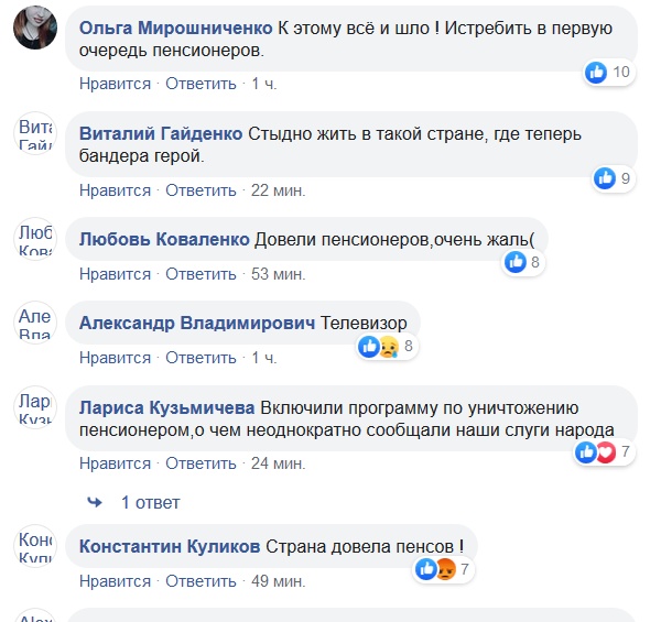 «А как жить пенсионерам на 1200-1500грн, это же пи@дец, вот последствие. У меня сердце разрывается, когда вижу как они бедные покупают по 2-3 шт картошки, а коммуналка, а лекарство. От без выхода и прыгают из окон»,