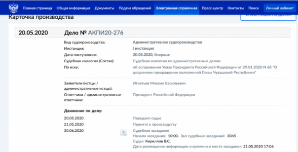 Верховный суд России принял к производству иск экс-губернатора Чувашии Михаила Игнатьева, оспаривающего свою отставку с этого поста.