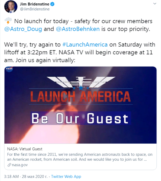 "Сегодня запуска не будет. Приоритетом для нас является безопасность членов экипажа - Дагласа Хёрли и Роберта Бенкена", - написал он в Twitter. Брайденстайн подтвердил, что теперь планируется осуществить запуск корабля с космодрома на мысе Канаверал (штат Флорида) к МКС 30 мая в 22:22 мск.