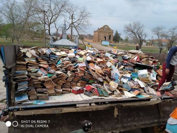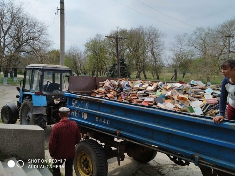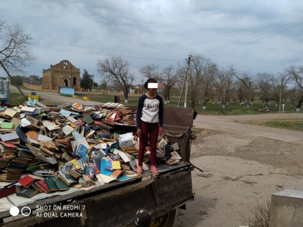 На видео, снятом в селе Долиновка Белгород-Днестровского района Одесской области, запечатлено, как школьники выносят книги из единственной в селе школьной библиотеки и грузят в прицеп.