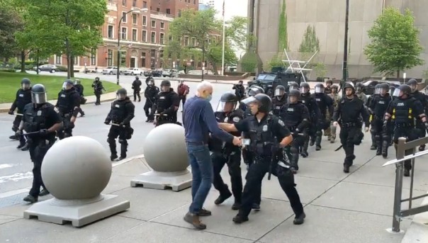 Местом действия стала площадь Ниагары, с которой днем 4 июня стражи порядка выгоняли протестующих против произвола полиции. Один из манифестантов, 75-летний мужчина, попытался объясниться с правоохранителями: пошел им навстречу, указывая на то, что они используют дубинки против невооруженных людей. Донести свою мысль он не успел — полицейские оттолкнули "парламентера". Он не устоял на ногах, упал на асфальт и сильно ударился головой. На кадрах видно, что у пострадавшего пошла кровь.