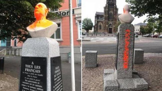 В городке Омон на севере Франции (регион О-де-Франс) неизвестные вымазали оранжевой краской бюст генерала-де Голля, находящийся на главной площади напротив церкви. На оборотной стороне стелы было написано: «раб». Такая же надпись появилась вечером рядом с мемориальной доской на улице Виктора Гюго, пишет Courrier-picard.