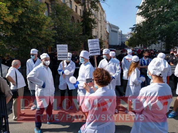 При этом на месте присутствуют люди в белых халатах с надписями "психбольница #6". На Telegram-канале утверждают, что это националист Евгений Карась собрался лечить сторонников Шария. Группу в белых халатах остановили правоохранители на первом шлагбауме на подходе к ОП и не пускают дальше.