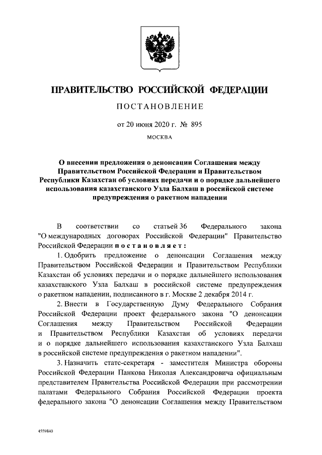 "Одобрить предложение о денонсации соглашения между правительством Российской Федерации и правительством Республики Казахстан об условиях передачи и о порядке дальнейшего использования казахстанского узла "Балхаш" в российской Системе предупреждения о ракетном нападении, подписанного в Москве 2 декабря 2014 года", —говорится в документе.