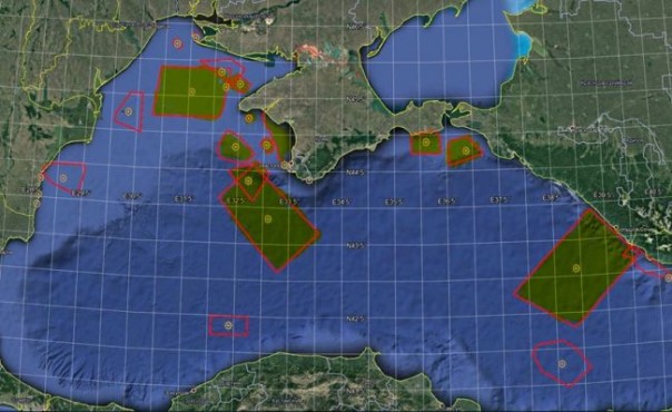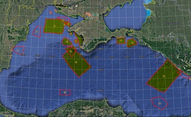 Касалось это как нейтральных вод у Севастополя и Южного берега Крыма, так и северо-западной части Черного моря, где расположены платформы для добычи газа для полуострова. Карту опубликовал на своей странице в Facebook главный редактор украинского интернет-ресурса Black sea news Андрей Клименко.