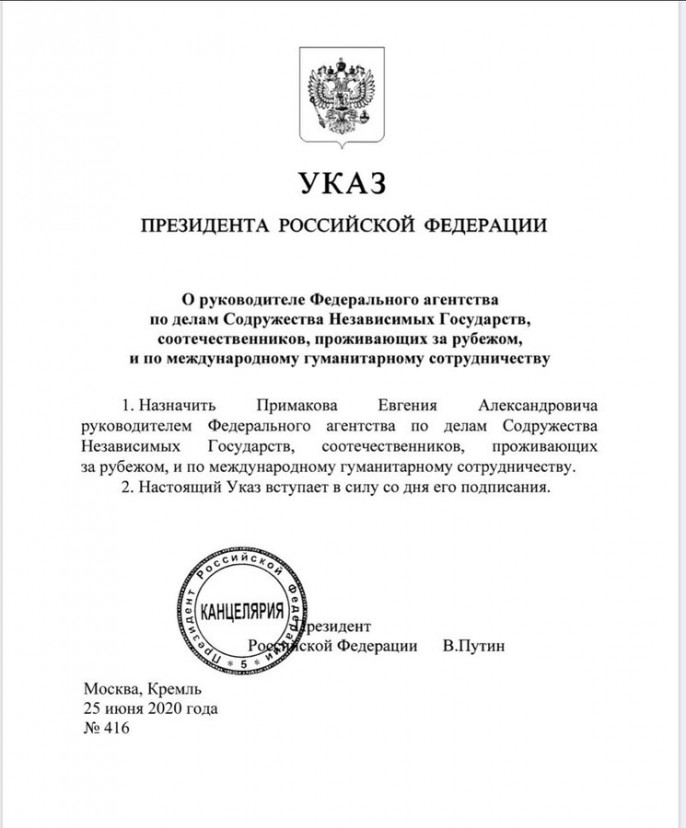 Владимир Путин подписал указ о назначении 44-летнего депутата, тележурналиста, общественного деятеля Евгения Примакова руководителем Россотрудничества (Федерального агентства по делам СНГ, соотечественников, проживающих за рубежом, и по международному гуманитарному сотрудничеству), подведомственного Министерству иностранных дел РФ и представленного в 80 странах мира.